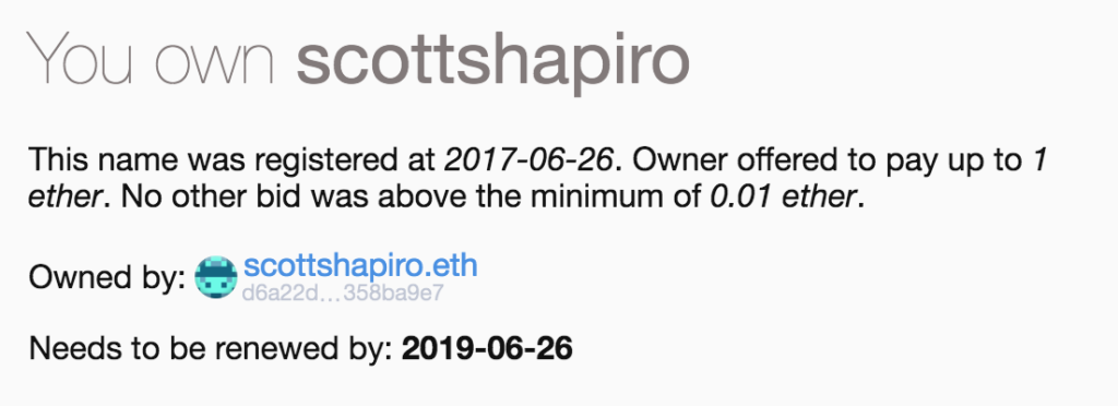 I ended up winning the auction, uncontested. There are a number of Scott Shapiros out there who have expressed interest in scottshapiro.com but scottshapiro.eth is a little more obscure.