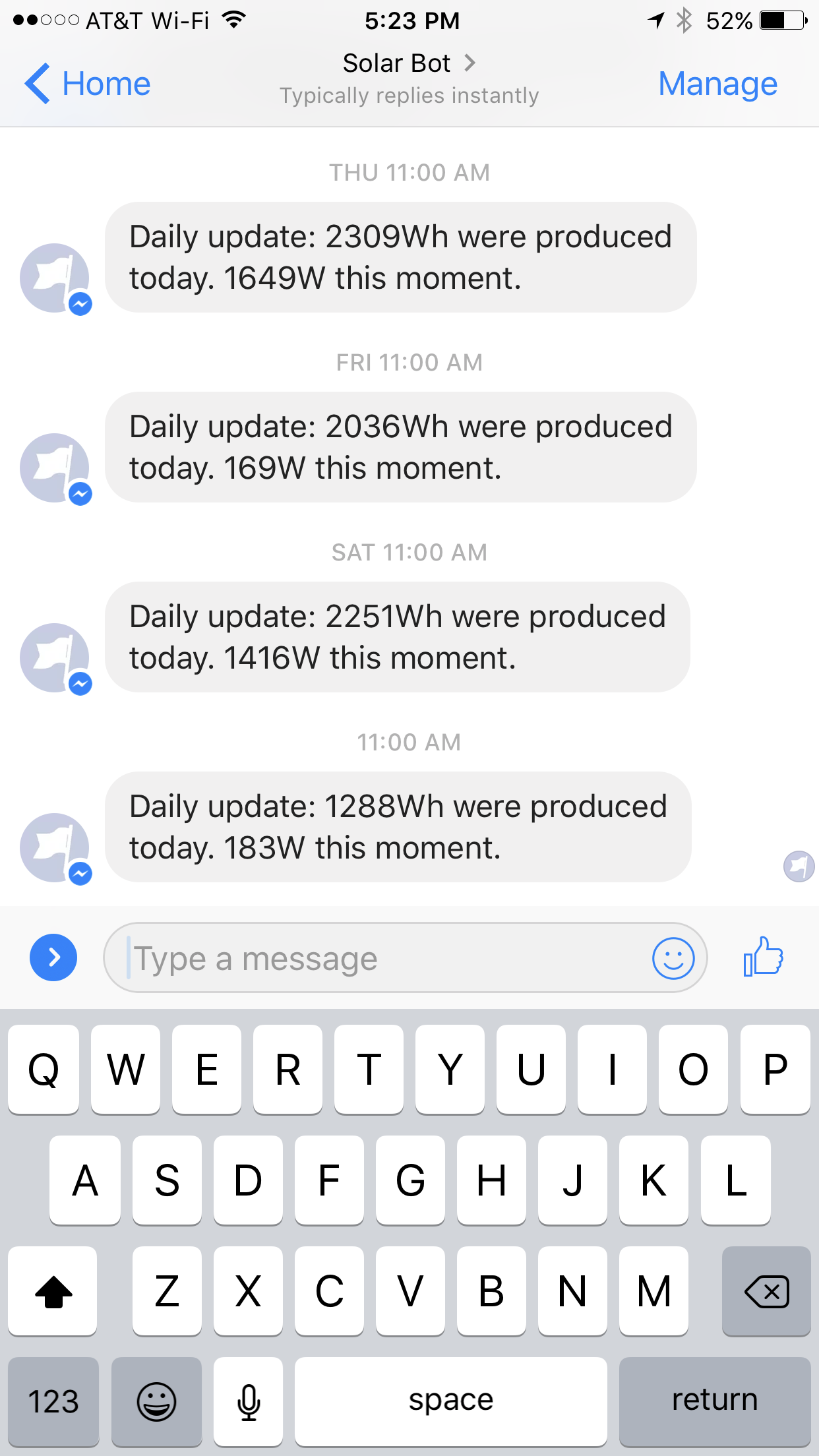 After implementing Alexa, I realized that it wouldn’t be a huge step to do something similar on Messenger. After all, push notifications was my top requirement.