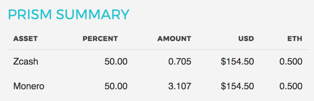 I called my prism MoneroZ because it’s 50/50 Monero and Zcash. These aren’t supported by my hardware wallet and are more difficult than others to store and utilize, so I figured this is where Prism could offer me some value. BTC and LTC on the other hand are very simple to use.